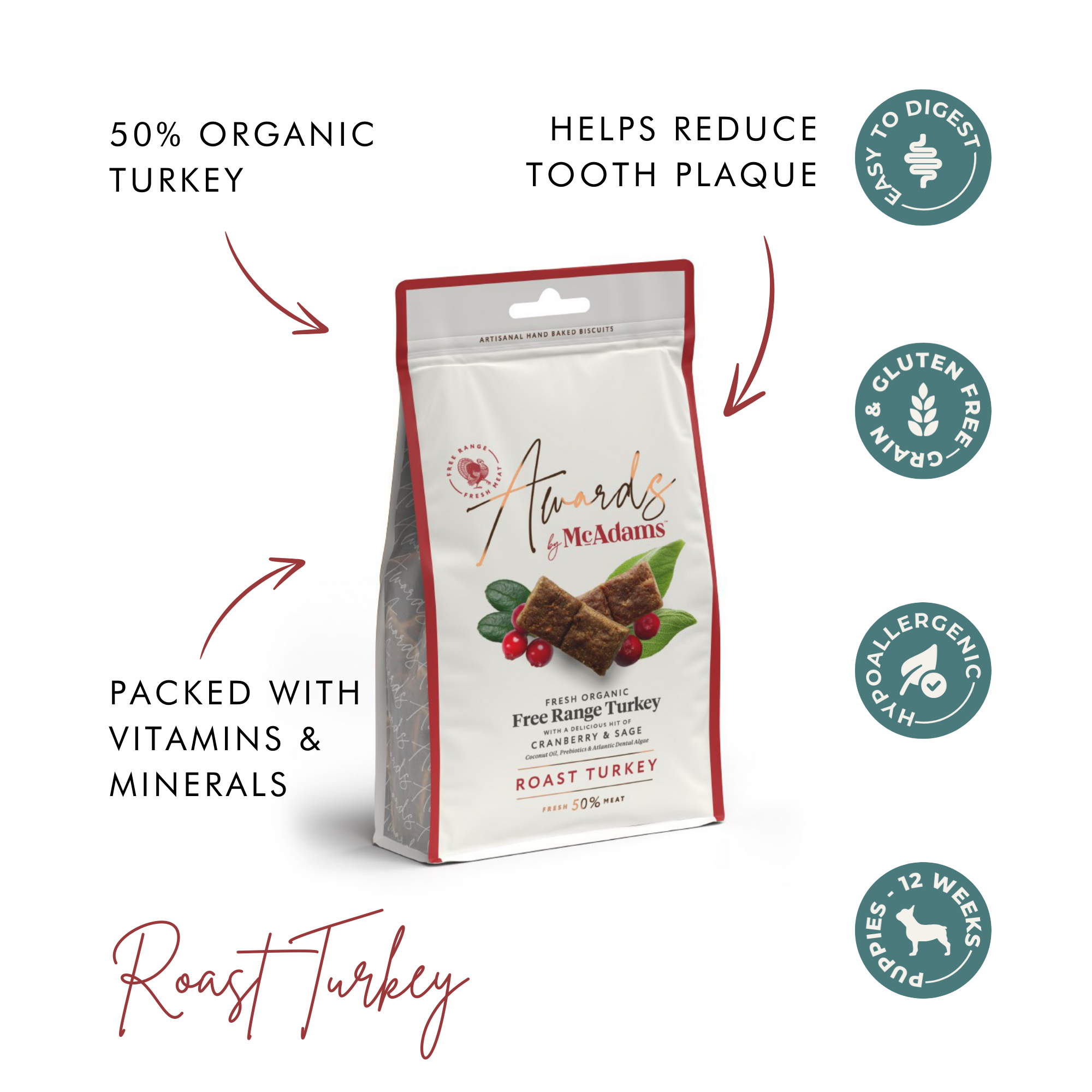 es! Made with 50% free-range organic turkey, these soft-baked treats are perfect for dogs of all breeds, sizes, and ages over 3 months.
