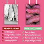 Natural Vegan Pawtato Dog Chews Ethical Alternative to Rawhide. Treat your dog to these innovative vegan Pawtato chew tubes, crafted with nutritious sweet potato and rice, enhanced with refreshing mint and parsley. These ethical chews offer a healthy, cruelty-free alternative to traditional rawhide treats.